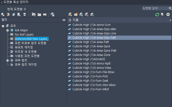 링크를 클릭하면 도면층 특성 관리자가 열리고 새 비조정 도면층 필터가 자동으로 선택됩니다. 도면 또는 첨부된 외부 참조에 추가된 모든 새 도면층이 리스트 뷰에 표시됩니다.