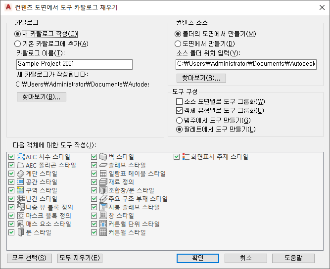 주: 두 옵션 모두 활성화된 경우 먼저 카탈로그가 도면별로 그룹화된 다음 객체 유형별로 그룹화되어 도면에서 범주가 생성되고 객체 유형에서 팔레트가 생성됩니다. 팔레트는 중첩될 수 없으므로 이와 같은 과정이 진행됩니다. 이 경우 범주 및 팔레트에 대한 라디오 버튼이 비활성화되고 카탈로그에 대해 팔레트에서 도구 작성 옵션이 선택됩니다.