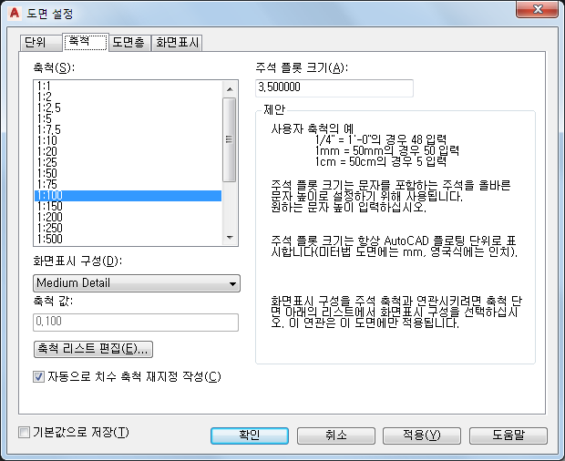 | 현재 도면에 대한 축척 설정만 저장 | 기본값으로 저장을 선택 해제하고 적용을 클릭합니다. |