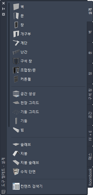 | CAD 관리자에 의해 작성된 사용자 도구 팔레트 | 프로젝트 또는 사무용 표준에 맞게 CAD 관리자가 사용자화한 조합창/문 스타일 및 특성 |