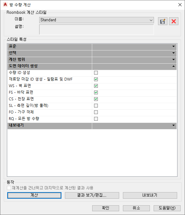 2. 방 수량 계산 대화상자의 스타일 특성 아래, 도면 데이터 생성 리스트에서 재료당 마감 ID 생성을 선택합니다.