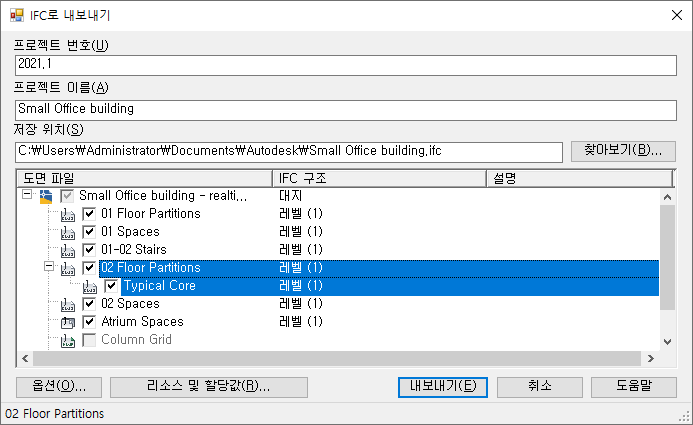 도면이 AutoCAD Architecture 2021 toolset 프로젝트의 일부로 레벨에 지정된 경우 해당 레이블이 기본적으로 IFC 구조에 표시됩니다. 그렇지 않으면 기본적으로 레벨 1에 매핑됩니다.