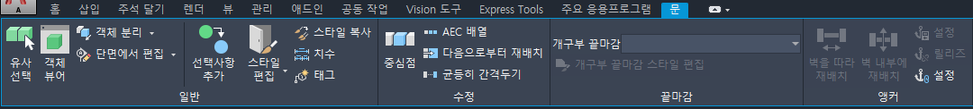 - 상황별 탭은 도면 영역에 선택된 객체에 따라 다르게 표시됩니다. 문을 선택하면 문에 대한 상황별 탭이 표시됩니다. 상황별 탭의 명령은 객체의 상황에 맞는 메뉴에 있는 명령을 반영합니다.