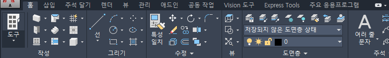 - 고정 탭은 도면 영역에 선택된 객체와 관계 없이 사용할 수 있습니다. 이러한 탭의 명령은 이전에 메뉴와 도구막대에 있었습니다.