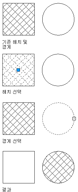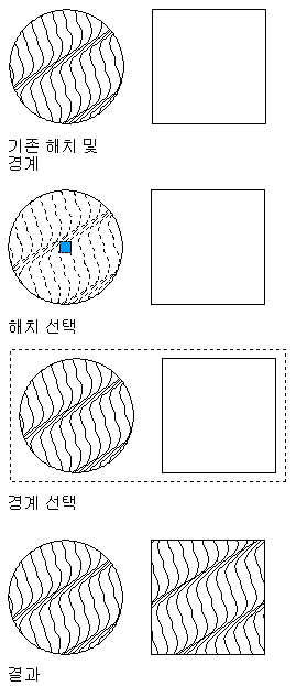 주: 해치가 원래 연관으로 작성된 경우 연관성은 경계 설정 옵션을 사용하여 해치가 적용되는 다른 라인워크로 전달되지 않습니다. 원래 경계 자체가 작업 동안 선택된 경계의 하나일 경우 경계와 해치 사이의 연관은 계속되지 않습니다.