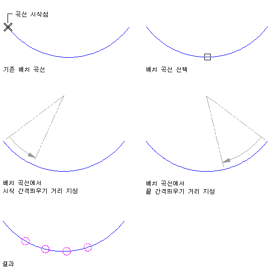 | 곡선을 따라 고정된 노드 수 간격두기 | s(균등히 간격두기)를 입력합니다. 처음 및 마지막 노드의 시작 및 끝 간격띄우기를 지정한 후 노드 수를 지정합니다. |
