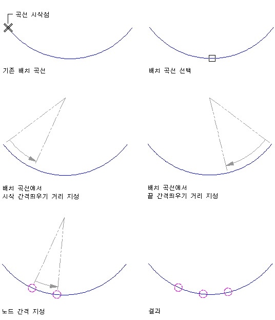 | 지정된 위치에 노드 배치 | Enter 키를 누릅니다. 노드 수를 입력한 후, 노드를 선택하거나 곡선의 시작 점에서 거리를 입력하여 노드의 위치를 지정합니다. |