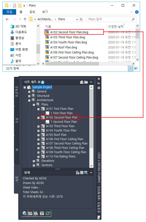 - 폴더를 프로젝트 네비게이터에서 선택된 탭의 도면 탐색기에 놓습니다.