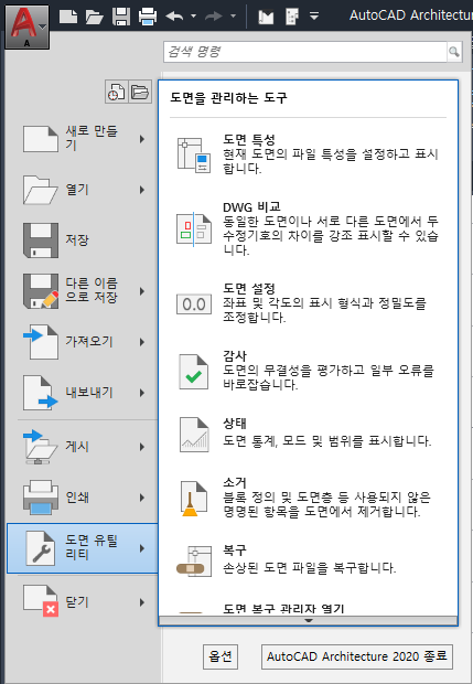 응용프로그램 메뉴에는 열기, 저장, 인쇄 및 내보내기와 같은 전반적으로 도면과 관련된 기본적인 명령이 들어 있습니다. 이를 대치하는 메뉴 검색기와 마찬가지로 응용프로그램 메뉴는 작업공간의 왼쪽 위 구석에 있는