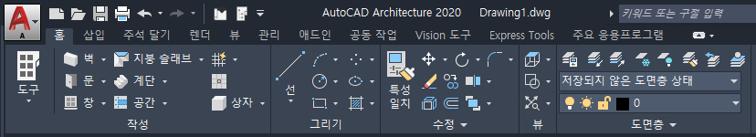 AutoCAD Architecture 2021 toolset에는 하나의 기본 작업공간(Architecture)이 제공됩니다. 이제 이전에 제공된 작업공간(설계, 문서, 상세, 시각화)과 연결된 메뉴 및 명령을 리본의 탭에서 액세스할 수 있습니다.