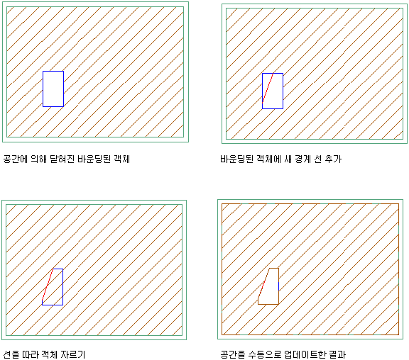 자르기 위치에서 새 경계 객체를 대체하여 경계 객체를 자른 경우 새 객체는 이전에 공간을 바운딩하지 않았으므로 해당 공간의 경계 객체로 자동으로 인식되지 않습니다. 이 경우 새 경계 객체를 인식하도록 공간을 수동으로 업데이트해야 합니다. 다음 예제를 참고하십시오.
