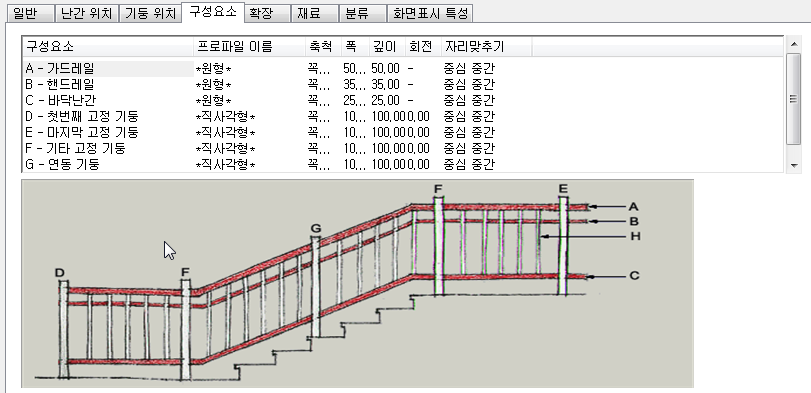 프로파일을 사용하여 사용자 쉐이프를 가진 난간 구성요소를 작성할 수 있습니다. 사용자 지정 프로파일은 스타일 관리자에 있는 난간 스타일의 구성요소 탭에서 구성요소를 대치합니다.