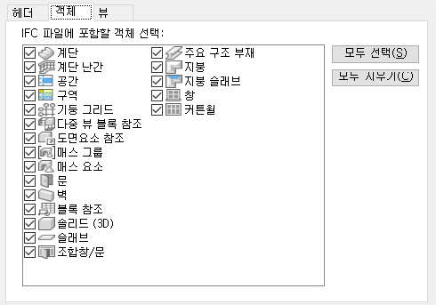 - 객체 탭을 클릭하고 IFC 파일에 포함할 객체를 선택합니다.