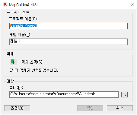 객체를 게시할 도면이 건물 프로젝트의 일부일 경우 프로젝트 이름 및 도면의 레벨 지정이 MapGuide로 게시 대화상자에 표시됩니다.
