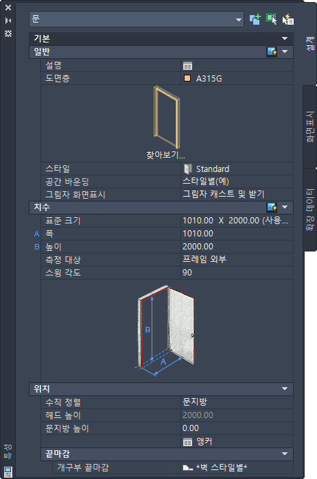 - 특성 팔레트: 특성 팔레트는 객체에 대한 정보를 입력 및 변경할 수 있는 중심 위치 중 하나입니다. 이 팔레트에는 유형별로 특성을 그룹화하는 범주가 있습니다.