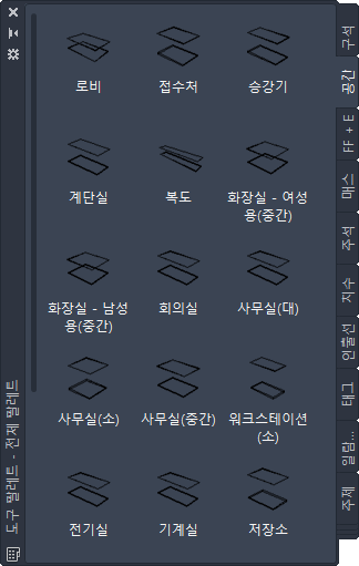 CAD 관리자 또는 다른 사용자가 작성한 사용자 팔레트는 프로젝트나 사무용 표준에 맞게 사용자화된 공간 스타일 및 특성을 가진 공간 도구를 포함할 수도 있습니다.