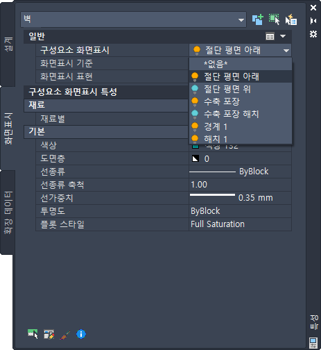주: 선택된 구성요소에 대해 화면표시 탭에 표시되는 특성 설정은 화면표시 시스템에만 해당됩니다. 대부분의 경우 이러한 설정은 도면층 특성 관리자에서 연관된 도면층의 설정(기본값 또는 재지정)과 다릅니다.