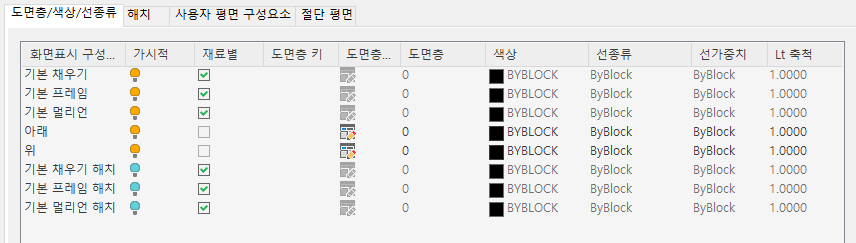 | 절단 평면 높이의 값보다 낮은 높이 | 객체는 도면층/색상/선종류 탭의 절단 평면 아래 구성요소에 대해 지정된 특성을 사용하여 표시됩니다. |