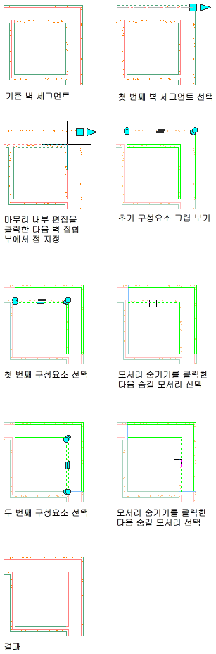 다음 과정에 따라 벽 구성요소 모서리를 숨겨 벽 교차를 수정하십시오. 이것은 올바르게 표시되지 않는 구성요소 모서리가 포함된 교차 조건이 있는 경우에 유용합니다.