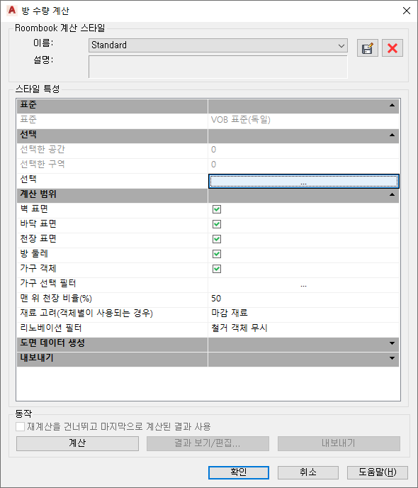 방 수량 계산이 이미 수행된 후에 새 공간 또는 구역이 도면에 추가된 경우 이 옵션을 선택하면 새 공간 또는 구역이 다음 계산에 자동으로 포함됩니다. 기본적으로 이 옵션은 활성화되어 있습니다.