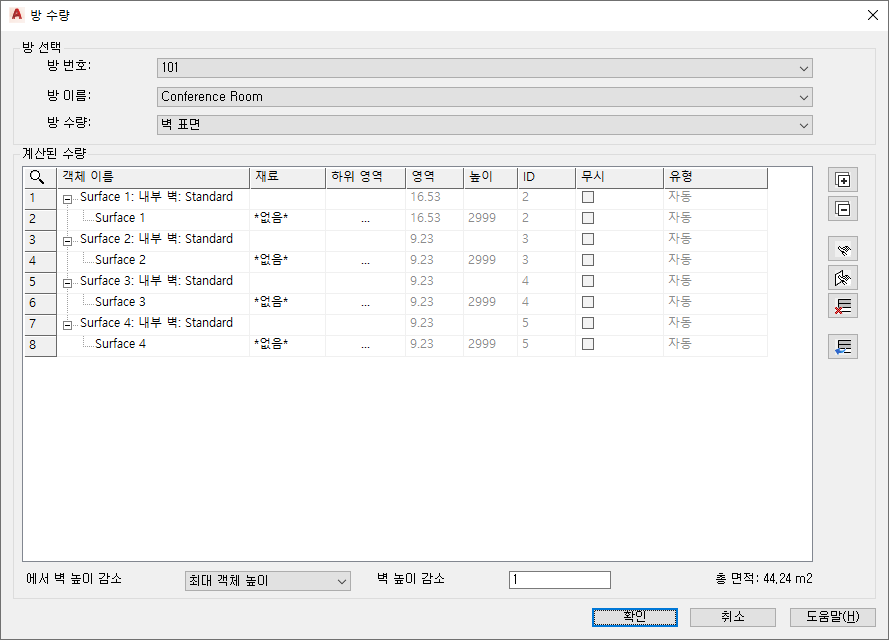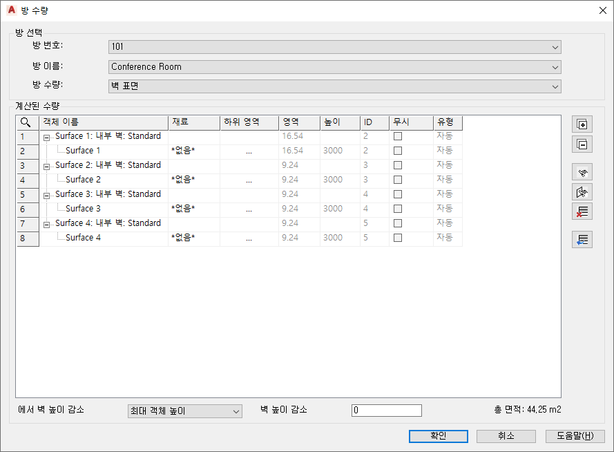 - 방 수량 대화상자의 방 선택 아래, 방 수량 리스트에서 벽 표면을 선택합니다.