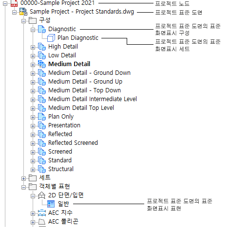 다음 절차에 따라 프로젝트 표준 화면표시 도면의 표준 화면표시 설정을 변경하고 버전을 적용하십시오.