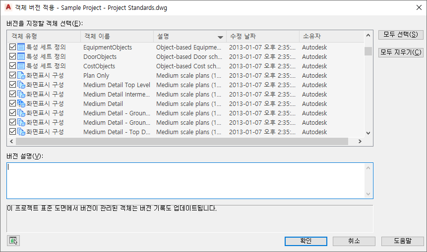 버전 관리에 선택된 모든 객체에 설명이 추가됩니다.