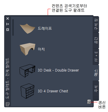 도구 팔레트가 컨텐츠 검색기에 있는 카탈로그의 도구 팔레트 세트에 연결된 경우 팔레트의 맨 아래에 새로고침 버튼이 표시됩니다.