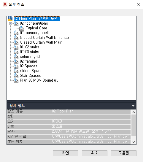 외부 참조 대화상자에 뷰에 있는 외부 참조의 리스트가 표시됩니다.