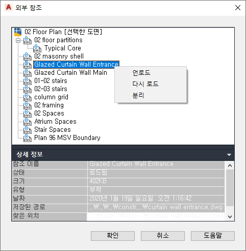 부착된 외부 참조를 언로드, 다시 로드 또는 분리할 수 있습니다.