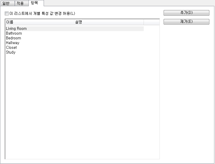 리스트 정의는 공간 및 구역에 대한 명명된 리스트입니다. 리스트 정의를 공간 스타일이나 구역 스타일에 부착하여 해당 스타일로 삽입한 모든 공간 또는 구역이 리스트의 이름을 사용하도록 할 수 있습니다. 리스트 정의는 다양한 목적으로 작성될 수 있습니다. 예를 들어 건물 표준에 따라 공간에 대해 일관된 이름을 지정할 수 있습니다.