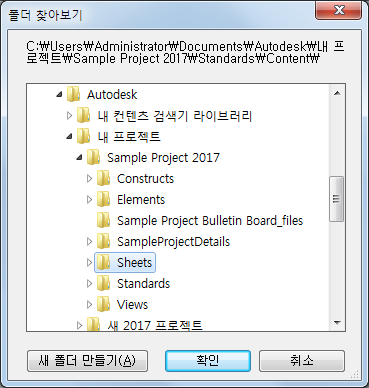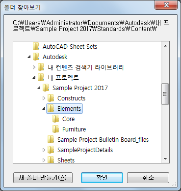 최상위 범주 폴더(구성, 요소, 뷰 및 시트)에 다른 위치를 지정하려면 새 프로젝트로 시작하는 것이 가장 좋습니다. 먼저 APJ 파일과 동일한 루트 폴더에 있는 범주를 사용하여 Windows 탐색기에서 프로젝트 구조를 구성합니다. 예를 들어, 도면이라는 범주 아래 구성, 요소, 뷰 및 시트를 사용하여 프로젝트를 구성할 수 있습니다.