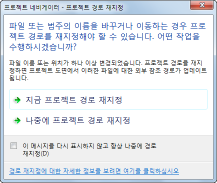 프로젝트 네비게이터 - 프로젝트 경로 재지정 대화상자가 표시됩니다.