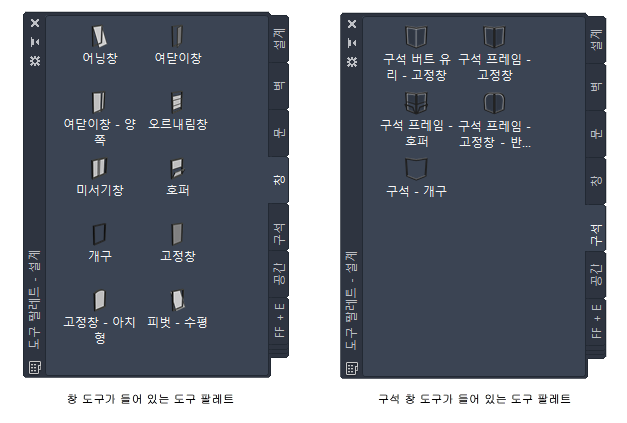 | CAD 관리자에 의해 작성된 사용자 도구 팔레트 | 프로젝트 또는 사무실 표준에 대해 사용자화된 창 스타일 및 특성을 가진 창 도구 |