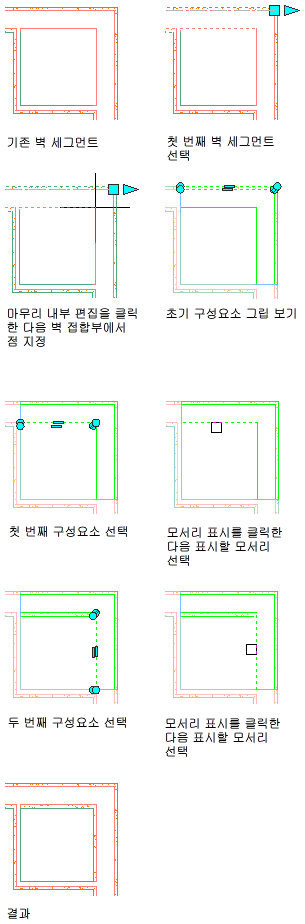 다음 예에서는 이전에 숨겨진 벽판 구성요소 모서리를 표시하여 내부 구석 조건을 작성합니다.