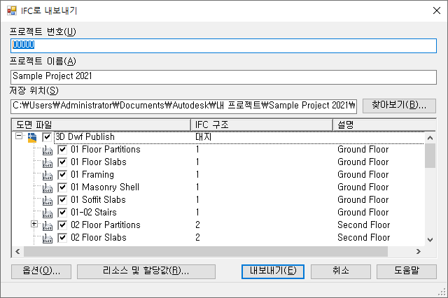 내보낼 프로젝트 도면을 선택하면 프로젝트 번호, 프로젝트 이름 및 외부 참조에 대한 레벨 할당값을 비롯한 식별 정보가 프로젝트에 기본적으로 표시됩니다.