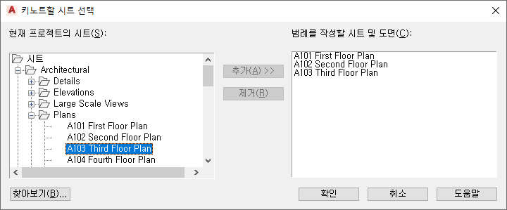 | 다른 시트의 모든 키노트 포함 | 오른쪽 클릭한 후 시트를 클릭하여 키노트 범례에 대한 시트 선택 대화상자를 표시합니다. 왼쪽 창에는 현재 프로젝트의 시트가 나열됩니다. 원하는 시트를 선택하고 추가를 클릭하여 오른쪽 창으로 이동시킵니다. 또한 찾아보기를 클릭하여 시트로 저장되지 않은 다른 프로젝트나 도면의 시트를 찾고 검색할 수 있습니다. 오른쪽 창에 키노트를 포함할 모든 도면/시트가 표시되면, 확인을 클릭합니다. |