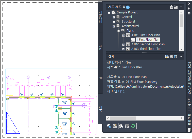 시트 뷰는 뷰 도면이나 모형 공간 뷰를 프로젝트 네비게이터 팔레트에서 시트로 끌어 놓을 때 작성되는 시트의 도면 공간 뷰포트입니다.