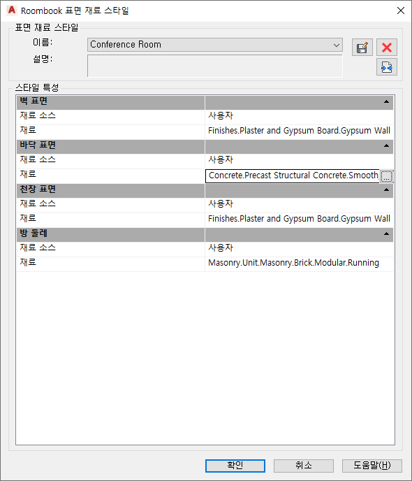 - Roombook 표면 재료 스타일 대화상자에서 기존 표면 재료 스타일을 작성 또는 편집하거나 카탈로그에서 표면 재료 스타일을 로드합니다.