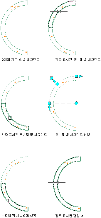 다음 그림에서는 각각의 별도 세그먼트를 강조 표시한 후 두 개의 곡선 벽 세그먼트를 결합하는 방법을 보여줍니다.