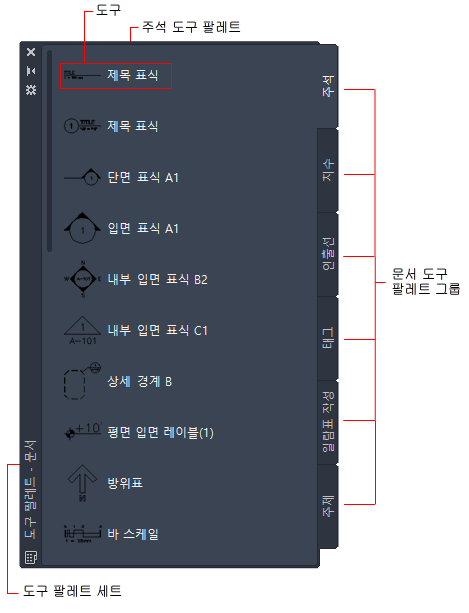 도구 팔레트 그룹은 도구 팔레트의 집합입니다. AutoCAD Architecture 2021 toolset를 시작할 때에는 설계, 문서, 상세 및 시각화 등의 4가지 도구 팔레트 그룹을 사용할 수 있습니다. 도구 팔레트 그룹을 추가, 이름바꾸기, 제거, 내보내기, 가져오기 및 재정렬할 수 있습니다. 도구 팔레트 그룹은 도구 팔레트 세트에 포함됩니다.