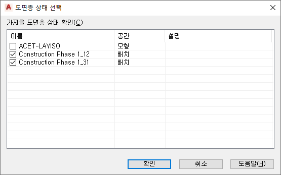 현재 도면에서 중복 도면층 상태를 가져올 경우 기존 도면층 상태를 덮어쓸지 아니면 해당 도면층 상태를 가져오지 않을지를 선택할 수 있습니다.