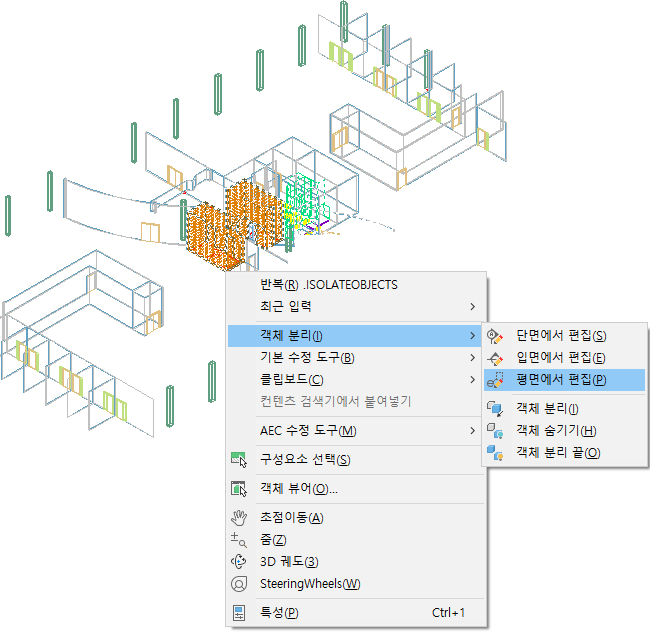 도면에서 객체를 선택하고 임시 단면, 입면 또는 평면도에서 객체를 보고 편집할 수 있습니다. 객체를 편집하는 동안 UCS가 임시 뷰에 정렬됩니다.