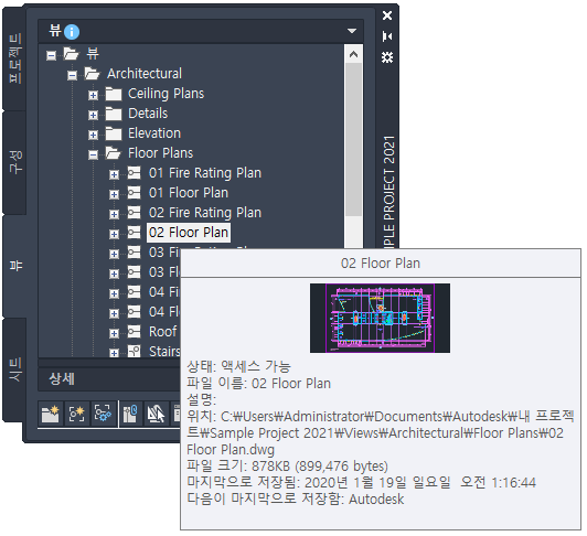 | 프로젝트 네비게이터 팔레트의 아래쪽에 미리보기 또는 상세 정보 창 표시 | 미리보기/상세 정보 창을 선택합니다. |