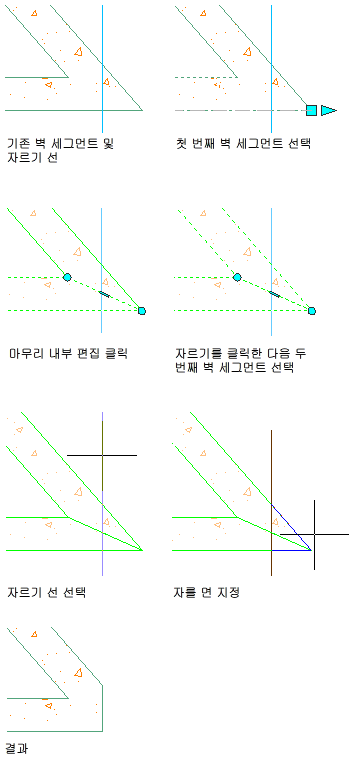 다음 절차에 따라 구성요소를 잘라내 벽 교차를 수정하십시오. 자르기 경계는 선, 호, 원, 폴리선 또는 벽 구성요소 모서리일 수 있습니다.