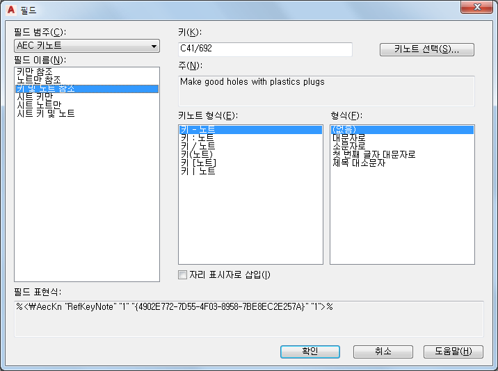 다음 과정에 따라 도면에 삽입할 키노트 필드를 선택하십시오.