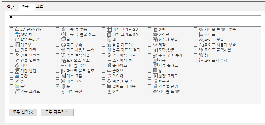 예를 들어, 분류 정의를 문과 창에 적용하도록 지정하는 경우 도면에 있는 모든 문 및 창 스타일의 분류 탭에 분류가 나열됩니다. 특성 팔레트의 확장 데이터 탭에서 각 문과 창 객체에 적합한 개별 분류를 선택할 수도 있습니다.