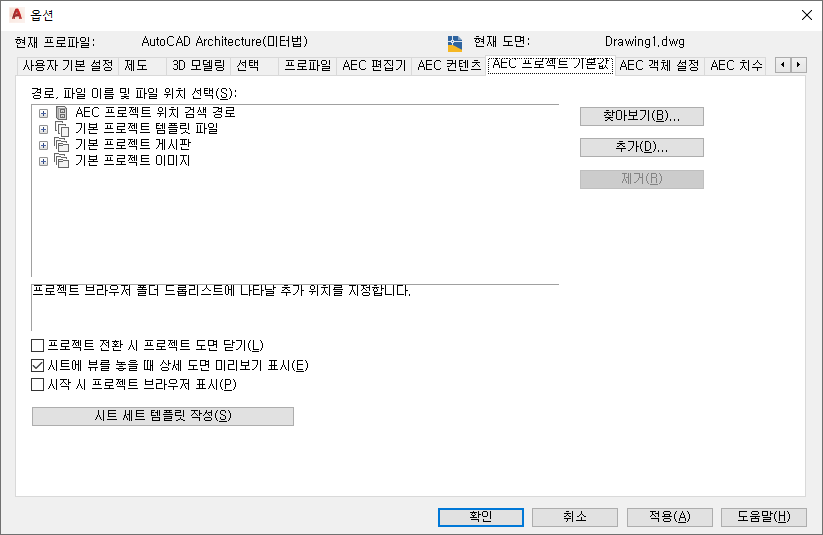 현재 도면에 대해 AEC 프로젝트 기본값 옵션 지정