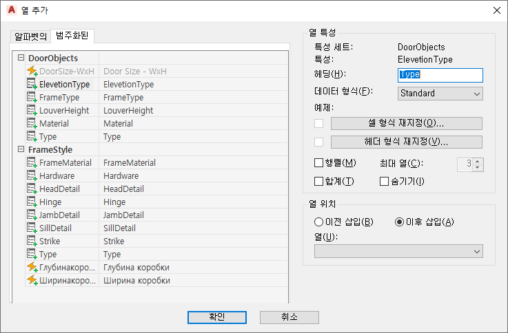 열 추가 워크시트가 열립니다.