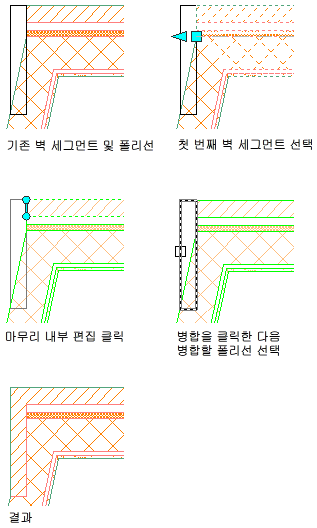 다음 과정에 따라 프로파일을 구성요소에 병합하여 벽 교차를 수정하십시오. 프로파일은 해당 구성요소와 겹치거나 일치하는 모든 폴리선-닫힌 영역일 수 있습니다.